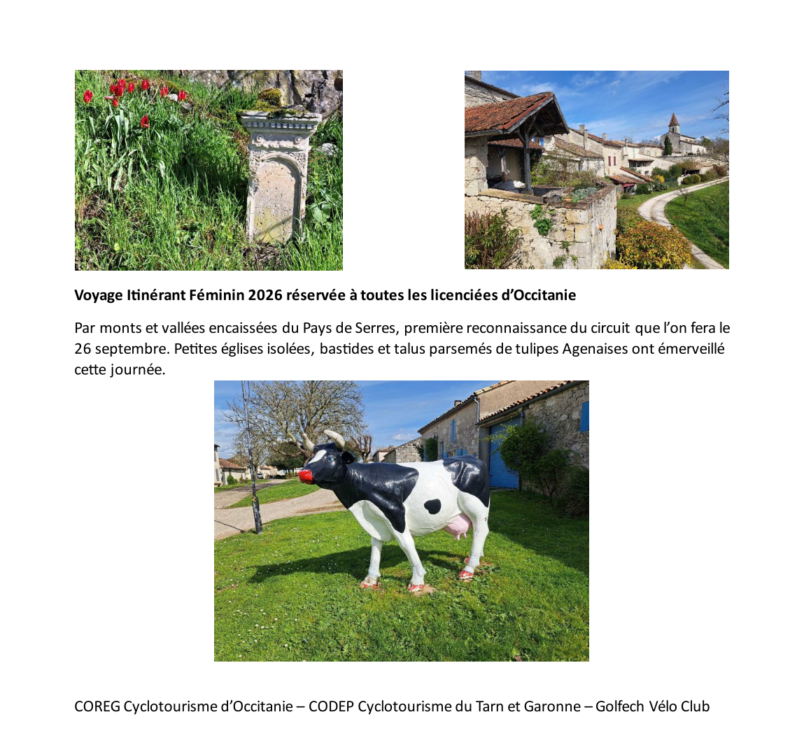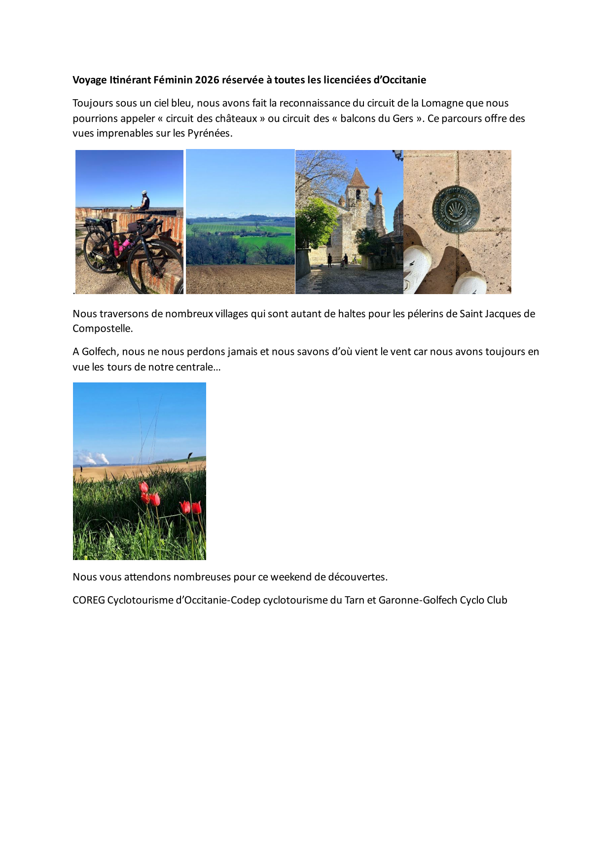 LE COREG OCCITANIE a confié au Codep du Tarn et Garonne l’organisation du Voyage Itinérant Féminin 2026. Au départ de Golfech, village frontière avec la région Nouvelle Aquitaine, nous rejoindrons la Base de Loisirs de Saint Nicolas de la Grave, lieu d’hébergement.